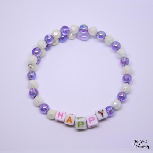 A simple piece, perfect for little girls. A combination of white and shiny purple round beads lining the word 'HAPPY'.